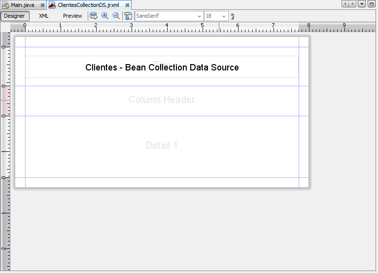 Com isso feito, o iReport vai conseguir enxergar as classes do nosso projeto, além de permitir que objetos de nossas classes possam ser utilizadas dentro do relatório. Vamos criar nosso relatório então? Clique então com o botão direito no <default package> da nossa pasta de definições de relatórios, escolha New -> Empty Report. Como já temos um relatório chamado Clientes (que usa uma query lembram?), vamos dar o nome nesse relatório de ClientesCollectionDS, pois vamos utilizar o datasource do tipo JRBeanCollectionDataSource. Assim que clicar em Finish no assistente de criação de relatórios, o arquivo ClientesCollectionDS.jrxml será gerado e será aberto no editor. Para simplificar, remova todas as bandas, exceto a Title, a Column Header e a Detail. Na banda Title crie um campo de texto estático e defina o título do relatório. O meu ficou assim: