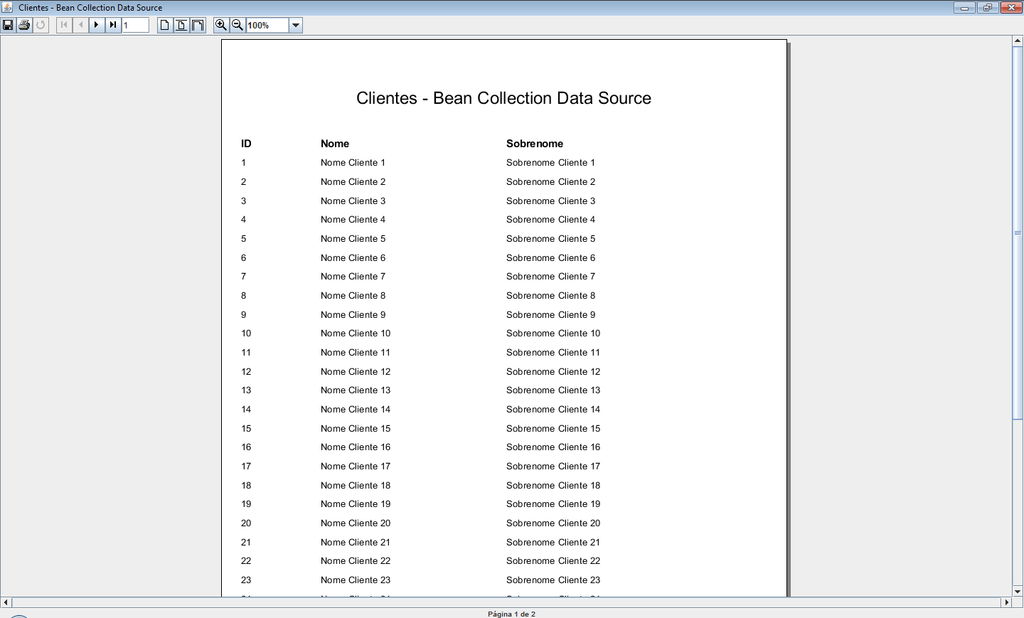 • JRBeanCollectionDataSource: Utilizada para usar coleções como fonte de dados, ou seja, qualquer classe que implemente – ou interface que estenda – a interface java.util.Collection. Por exemplo, um ArrayList, que implementa a interface List que por sua vez estende a interface Collection. A documentação deste tipo de datasource pode ser vista clicando aqui;